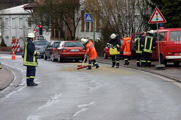 Einsatzkräfte des Löschbezirks Habach, die gerade auf der Rückfahrt von einer Umweltsäuberungsaktion waren, unterstützen ihre Kameraden und übernahmen die Beseitigung der Ölspur vom Ortseingang Habach bis zur Großwaldstraße.