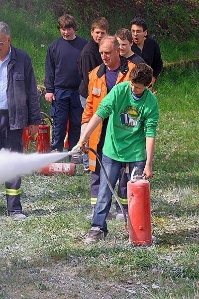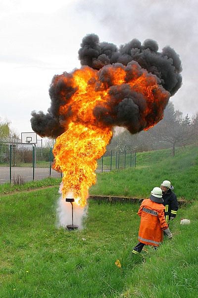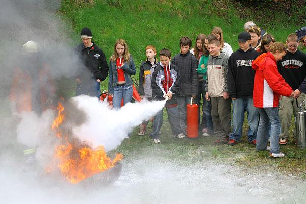 Doch richtig spannend wurde es dann im praktischen Teil: Dass man eine brennende Friteuse nicht mit Wasser löschen darf, hatten die Schülerinnen und Schüler zwar schon im theoretischen Unterricht gelernt, doch die Vorführung der daraus folgenden Fettexplosion hinterlies einen bleibenden Eindruck. Dann durfte selbst Feuerwehrmann gespielt werden: An einem Übungsfeuer konnte der Einsatz eines Feuerlöschers geübt werden. Zum Abschluss konnte dann ein Löschfahrzeug einmal aus der Nähe besichtigt werden.