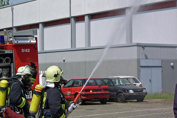 "Gebäudebrand, es werden noch Personen im Gebäude vermisst!", so die Ausgangslage für den Einsatzleiter. Während sich Feuerwehrmänner mit Atemschutzgeräten ausrüsten, bauen anderen die Wasserversorgung auf und bringen eine Leiter in Stellung. Unter Atemschutz tasten sich die Feuerwehrleute immer weiter in den dichten Rauch vor, bis die vermisste Person gefunden ist und gerettet werden kann.