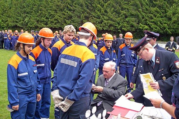 Auch eine Gruppe aus der Gemeinde Eppelborn nahm an den Prüfungen teil und musste ihr Können in Disziplinen wie Kugelstoßen, Staffellauf, Löschangriff und theoretischem Wissenstest beweisen. Zusammen mit ihnen waren auch Gruppen aus Schiffweiler, Heiligenwald, Landsweiler-Reden, Illingen, Stennweiler, Münchwies-Hangard, Spiesen-Elversberg und Ottweiler am Start. Alle absolvierten sie die gestellten Aufgaben zur Zufriedenheit der Wertungsrichter und bekamen das begehrte Leistungsabzeichen von Landrat Dr. Hinsberger verliehen. Die Leistungsspange stellt den Abschluß der Ausbildung in der Jugendfeuerwehr dar. Die meisten der Jugendlichen werden mit Erreichen des 16. Lebensjahres in die Reihen der Einsatzabteilung übernommen.
