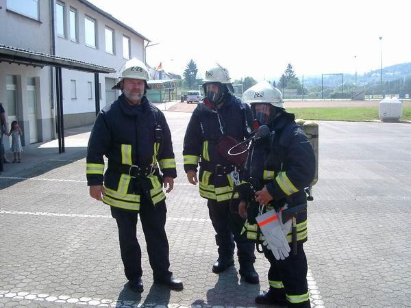 Der angenommene Brand im Aufenthaltsraum war durch einen Trupp unter schwerem Atemschutz im Innenangriff mit einem C-Rohr schnell bekämpft und das durch Theaterrauch vernebelte Treppenhaus mit dem Lüfter rauchfrei geblasen.