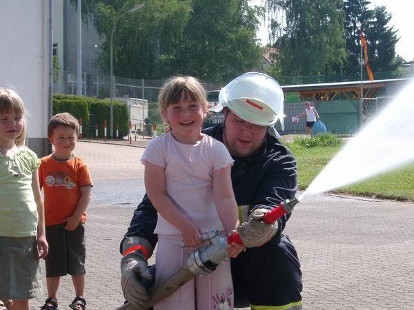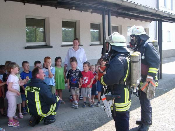 Im Anschluss an die Übung galt das Interesse der Kinder vor allem den Feuerwehrfahrzeugen. Viele Fragen wurden gestellt und natürlich wollte auch jeder mal ein Strahlohr halten. Zwischenzeitlich unterrichtete Stefan Morbe die Betreuerinnen über die Möglichkeiten der Brandvermeidung und der Bekämpfung von Entstehungsbränden mit den im Kindergarten vorhandenen Löschmittel.