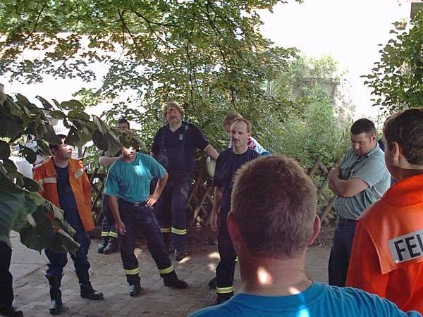 Nach der gelungenen Übung versammelten sich die total verschwitzen und durchnäßten Wehrleute im Schatten eines Baumes und die Übung wurde in allen Einzelheiten durchgesprochen.