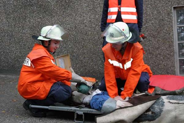 Die eintreffenden Einsatzkräfte mussten unter Atemschutz sowohl die Personensuche als auch die Brandbekämpfung durchführen. Ebenso mussten die Verletzten betreut und versorgt werden. Wie bei einem realen Einsatz wurde die Drehleiter der Feuerwehr aus Lebach hinzugezogen.