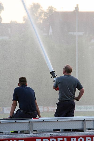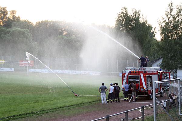 Mit zwei Wasserwerfern, die jeweils mehrere hundert Liter Wasser pro Minute ausbringen können, wurde der gesamte Rasenplatz bewässert. Der Einsatz der Feuerwehr soll jedoch eine Ausnahme bleiben. Deshalb soll die Bewässerungsanlage mit Hochdruck repariert werden, denn eine Wetteränderung ist in den nächsten Tagen noch nicht in Sicht.