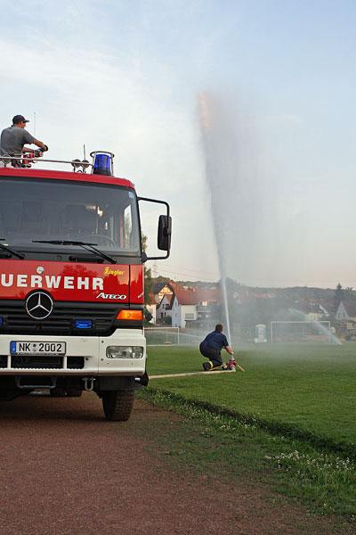 Da war Hilfe von den Spezialisten gefragt, die auch sonst gut mit Wasser umgehen können: Der Feuerwehr. Nachdem die Gemeindeverwaltung und Bürgermeister Fritz-Hermann Lutz grünes Licht gaben, rückten am Abend des 26. Juli 2006 die Feuerwehrmänner aus dem Löschbezirk Eppelborn mit einem Löschfahrzeug am Sportplatz in der Alfred-Groß-Straße an.