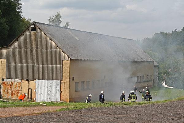 Sofort rüsten sich Einsatzkräfte aus Dirmingen und Eppelborn mit Atemschutzgeräten aus, um in der brennenden Scheune nach dem immer noch vermissten Landwirt zu suchen. Doch der Weg durch das Scheunentor ist durch einen Traktor versperrt. Mit der Seilwinde des Rüstwagens muss das Hindernis erst aus dem Weg gezogen werden, damit die Einsatzkräfte in das Innere der Scheune vordringen können.