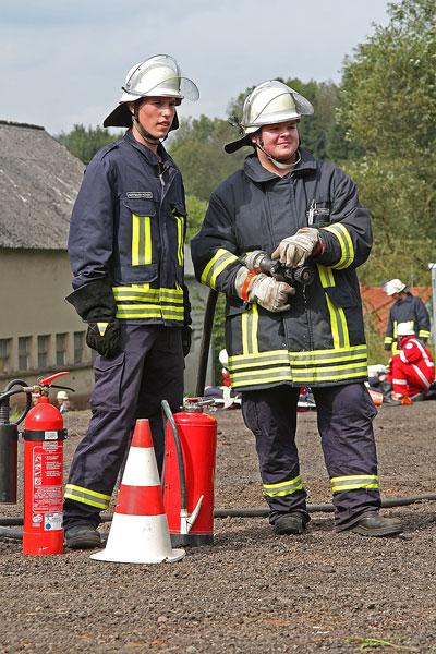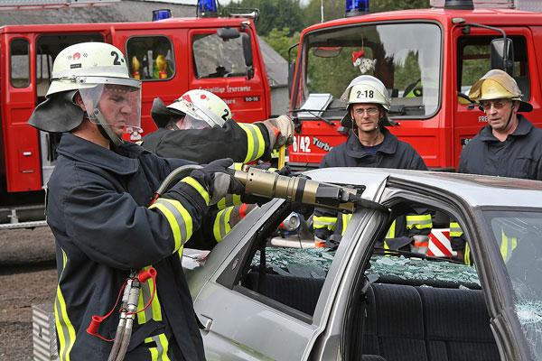 Während dessen beginnen die Feuerwehrleute aus Humes, Dirmingen und Bubach-Calmesweiler mit der Rettung der verletzten Feuerwehrmänner aus dem verunfallten Löschfahrzeug. Auch die Befreiung der in ihrem Wagen eingeklemmten Frau des Landwirts wird vorbereitet. Möglichst schonend wird die Frau aus ihrem Wagen befreit und dem DRK zur weiteren Versorgung übergeben.