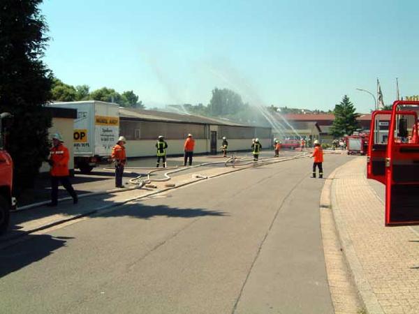 Soweit die Ausgangslage der überraschend angesetzten Alarmübung der Feuerwehr der Gemeinde Eppelborn. Innerhalb einer Viertelstunde nach Alarmierung waren die Löschbezirke Bubach-Calmesweiler, Dirmingen, Eppelborn, Habach, Humes Macherbach und Wiesbach mit mehr als 70 Einsatzkräften unter der Einsatzleitung des Gemeinde-Wehrführers am Brandort eingetroffen. Neben der Brandbekämpfung an der Lagerhalle mußten vom Brand überraschte Personen gerettet werden. Zu den angrenzenden Gebäuden wurde eine schützende Wasserwand aufgebaut, um ein weiteres Übergreifen der Flammen zu verhindern. Nach und nach wurden dann nicht mehr benötigte Fahrzeuge zur Sicherstellung des Brandschutzes in der Gemeinde aus dem Einsatzgeschehen herausgezogen.