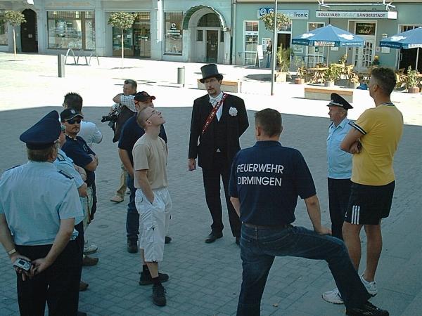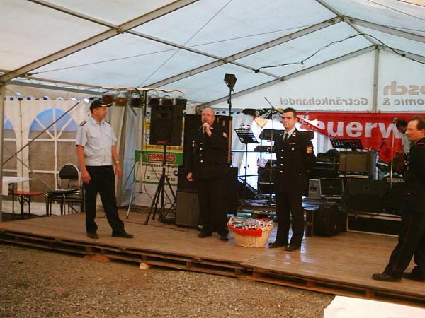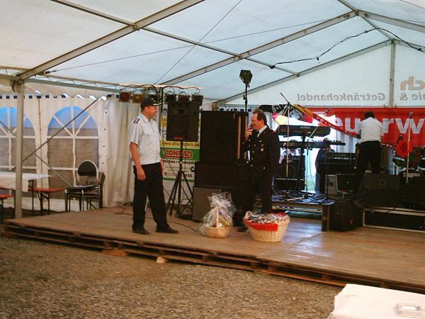 Nach dem Mittagessen ging es so langsam in Richtung offizielle Eröffnung des Feuerwehrfestes. Gegen 17 Uhr übernahm der Löschbezirksführer von Nehesdorf, Henri Wesnigk, das Mikrofon und eröffnete mit seiner netten Art das Fest. Hans-Werner Guthörl und Lars Eisenbeis, vom Löschbezirk Dirmingen, überreichten einen Präsentkorb und Oberlöschmeister Guthörl bedankte sich im Namen der Feuerwehr Dirmingen für die Einladung und die nette Begrüßung, die den Kameraden aus Dirmingen in jedem Jahr zu teil wird. Gleich im Anschluß wurde das Mikrofon an den Kameraden, Pierre Jungblut, der Feuerwehr aus Pfaffenthal in Luxemburg weitergegeben, der ebenfalls sich für die Einladung bedankte und ein Präsent überreichte.
