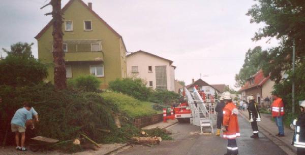 Da ein Fällen des Baumes mit der Motorsäge wegen vorhandenen Starkstromleitungen und umliegender Bebauung nicht in Frage kam, wurde die Drehleiter aus Illingen zur Unterstützung angefordert.