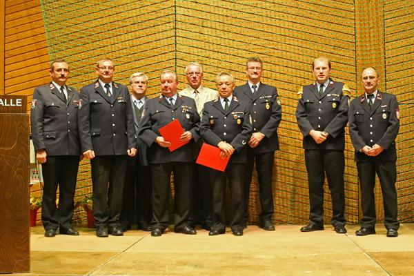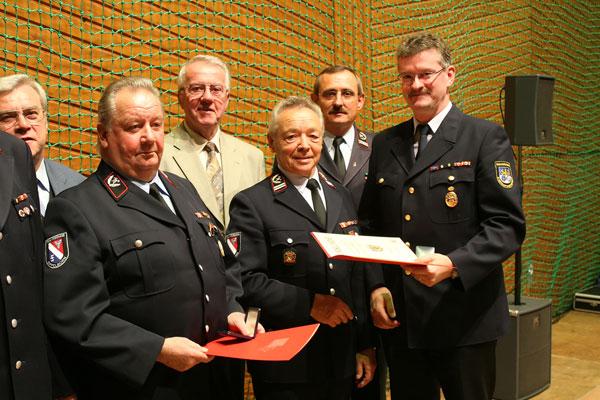 Der erste Vorsitzende des Kreisfeuerwehrverbandes Neunkirchen, Horst Malter konnte dann zwei ganz besondere Ehrungen vornehmen: Zusammen sind Edgar Peter und Alfred Schmitt bereits seit 100 Jahren Mitglied in der Feuerwehr. Beide erhielten vom Landesfeuerwehrverband eine Auszeichnung für 50jährige Mitgliedschaft in der Feuerwehr - eine Auszeichnung, auf die ein Löschbezirk stolz sein kann.
