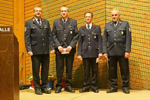 Recktenwald wiederholte noch einmal zwei wichtige Ehrungen im Auftrag des Bürgermeisters: Stephan Rein wurde vom Oberlöschmeister zum Brandmeister befördert, Löschmeister Wolfgang Götzinger erhielt eine Auszeichnung für seine 35jährige Mitgliedschaft in der Feuerwehr.