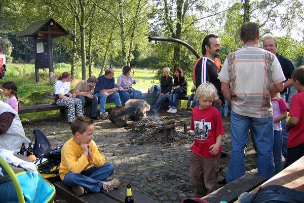 Gegen 14.00 Uhr starteten rund 40 Personen vom Feuerwehrgerätehaus in der Schleidstraße. Das anfänglich durchwachsene Wetter wurde schnell besser, und so kamen die Wanderer bei Sonnenschein zum ersten Ziel der Grillhütte an der Steinrausche