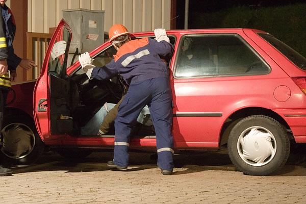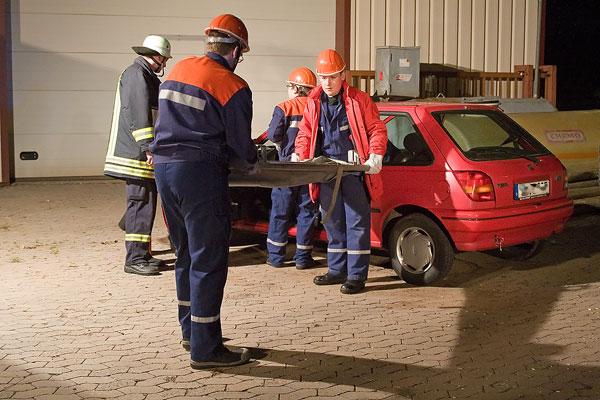 Genau wie bei den Großen baute der Feuerwehrnachwuchs zuerst Scheinwerfer auf, um die Einsatzstelle auszuleuchten. Mit einem Feuerlöscher und einem Strahlrohr wurde der Brandschutz sichergestellt, sollte es durch Funken zu einer Entzündung von Kraftstoff kommen. Nachdem ein Zugang zu den Insassen geschafft war, konnten sie aus dem Fahrzeug gerettet und mit einer Trage zur weiteren Versorgung gebracht werden.