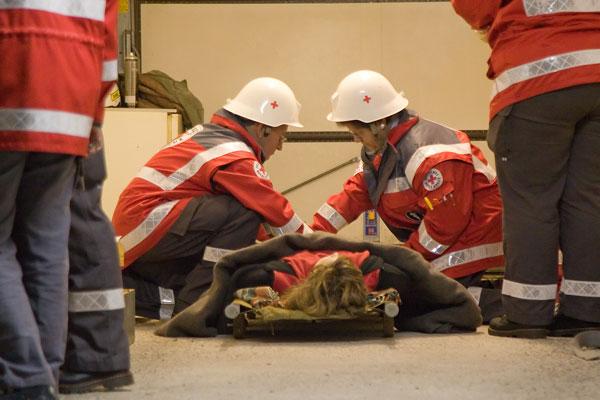 Trotz der Weitläufigkeit der Halle sind die Vermissten schnell gefunden. Mit Tragen werden sie von den mit Atemschutzgeräten ausgerüsteten Feuerwehrleuten ins Freie gebracht, wo bereits die Sanitäter warten. Nach einer ersten Sichtung der Verletzungen geht es direkt weiter in eine als Verbandsplatz umfunktionierten Garage. Hier werden sie weiter versorgt und für den Transport in Krankenhäuser vorbereitet.