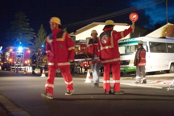 In der anschließenden Nachbesprechung zeigte sich Einsatzleiter Rudolf Raber zufrieden mit der Arbeit der 41 Einsatzkräfte der Feuerwehr und 20 Sanitäter der DRK-Ortsvereine Humes und Wiesbach. Auch wenn kleinere Fehler passierten, so war die Zusammenarbeit der unterschiedlichen Einheiten sehr gut, alle Aufgaben waren in kürzester Zeit bewältigt. Auch Gemeindewehrführer Hermann Josef Recktenwald, der als Beobachter an der Übung teilnahm, lobte den Einsatz der Helfer.