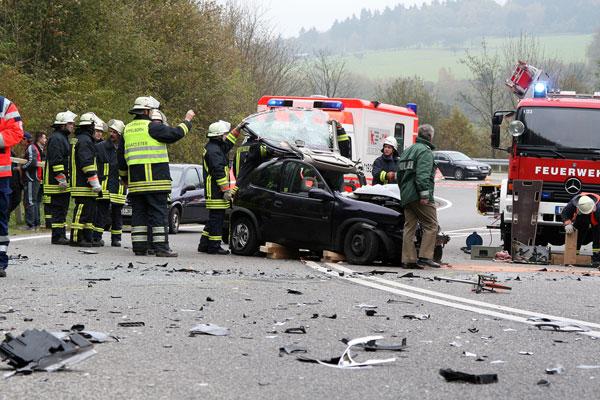 Gemeinsam mit dem inzwischen eingetroffenen Notarzt und Rettungsassistenten wird die eingeklemmte Fahrerin von Rettungssanitätern der Feuerwehr erstversorgt. Nach der Gabe von Schmerz- und Beruhigungsmitteln kann dann die Rettung der jungen Frau beginnen. Dazu müssen die Fahrertür sowie der vordere Teil des Wagendaches mit hydraulischen Rettungsgeräten entfernt werden. In enger Zusammenarbeit mit dem Notarzt des ebenfalls zur Unfallstelle entsandten Rettungshubschraubers gelingt es nach gut einer halben Stunde, die Fahrerin so schonend wie möglich zu befreien.