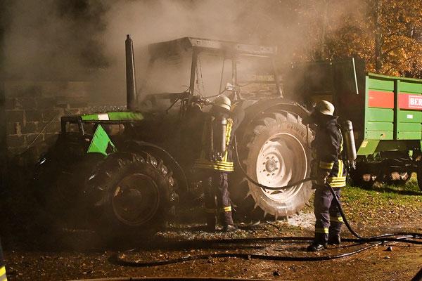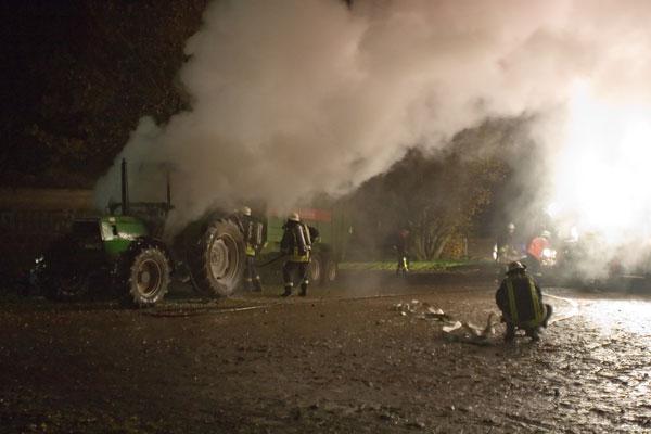 Glück im Unglück: Der Traktor, so der Eigentümer, steht normalerweise in einer Scheune, in der auch mehrere hundert Rundballen gelagert werden. Nicht auszudenken, wäre es hier zu einem Brand gekommen.