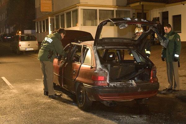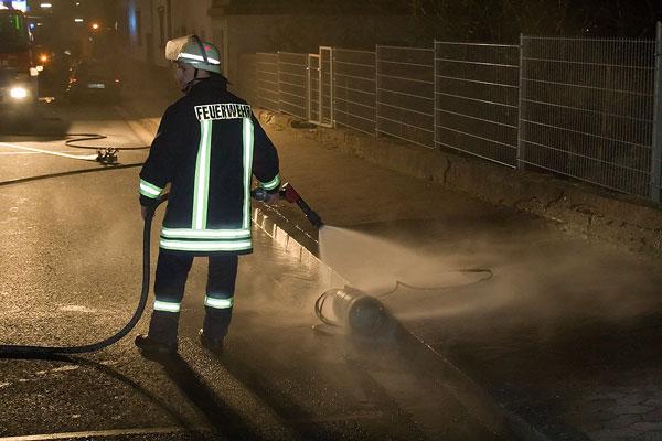 Die Einsatzkräfte der gegen 23.57 Uhr alarmierten Feuerwehr trafen kurz nach dem Alarm an der Einsatzstelle ein. Die Gasflasche, die selbst nicht explodiert war, wurde aus dem Kofferraum des Fahrzeugs geborgen und sicherheitshalber mit Wasser gekühlt. Der glücklicherweise nur leicht verletzte und unter Schock stehende Fahrer wurde von Rettungssanitätern der Feuerwehr bis zum Eintreffen des Notarztes versorgt.