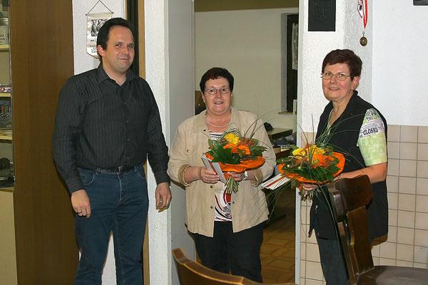 Schriftführer Eric Holzer dankte den Frauen des Floriansstübchens Hiltrud Becker und Doris Rau mit einem Blumenstrauß und einem Präsent für die Bewirtung der Feuerwehrleute nach Übungen und Ausbildungen im vergangenen Jahr.
