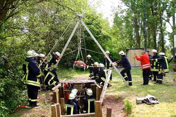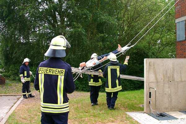Übungsziel an diesem Tag war es, verunfallte Personen aus dem zweiten Stockwerk eines Hauses zu retten. Ein weiteres Übungsziel war das Retten von Personen aus Baugruben.