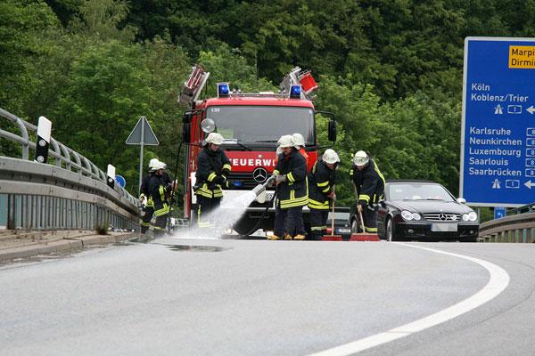 Aufgrund der Regenwitterung und dem gefährlichen Kurvenverlauf entschied die Polizei, die Feuerwehr zur Beseitigung der Verschmutzung anzufordern. Gegen 17:36 Uhr wurde der Löschbezirk Eppelborn über Funkmeldeempfänger alarmiert.