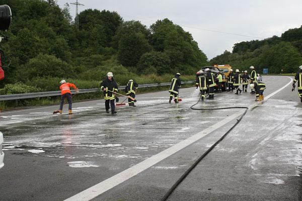 Durch den Unfall wurde das Fahrzeug so stark beschädigt, dass Öl und Kraftstoff auf einer Länge von 40 Metern auf die Fahrbahn liefen. Mit Ölbindemitteln reinigten die Einsatzkräfte die an dieser Stelle dreispurige Autobahn und halfen beim Aufsammeln der Fahrzeugtrümmer. Während der Aufräum- und Reinigungsarbeiten musste die Autobahn in Fahrtrichtung Trier kurzzeitig voll gesperrt werden.