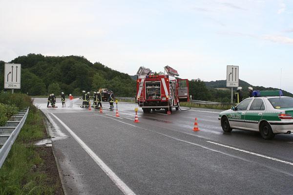 Eppelborn. Am Abend des 10. Juni 2007 wurde der Löschbezirk Eppelborn gegen 19:06 Uhr zu einem Verkehrsunfall auf die Autobahn A1 gerufen. Dort war ein Porschefahrer in Fahrtrichtung Trier zwischen den Anschlusstellen Tholey und Hasborn mit seinem Fahrzeug auf regennasser Straße von der Fahrbahn abgekommen und gegen die Leitplanken gekracht. Das Fahrzeug schleuderte über die mehrspurige Autobahn und blieb quer zur Fahrtrichtung in der Fahrbahnmitte stehen.