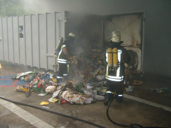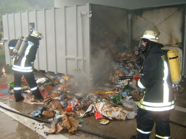 Die bereits wenige Minuten nach der Alarmierung eintreffenden Einsatzkräfte konnten die Flammen in der Presse schnell bekämpfen. Zum Erreichen des Brandherds musste der Container mit dem Rüstwagen von der Presse weggezogen werden. Nach Öffnung des Containers wurden die glimmenden Reste abgelöscht.