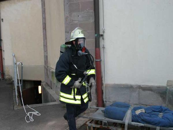 Mit Hilfe einer Nebelmaschine wurde im Heizraum der Kirche unter der alten Sakristei ein Brand simuliert. Zusätzlich zur Personenrettung mußte auch eine effektive Brandbekämpfung unter Atemschutz in diesem Bereich durchgeführt werden.
