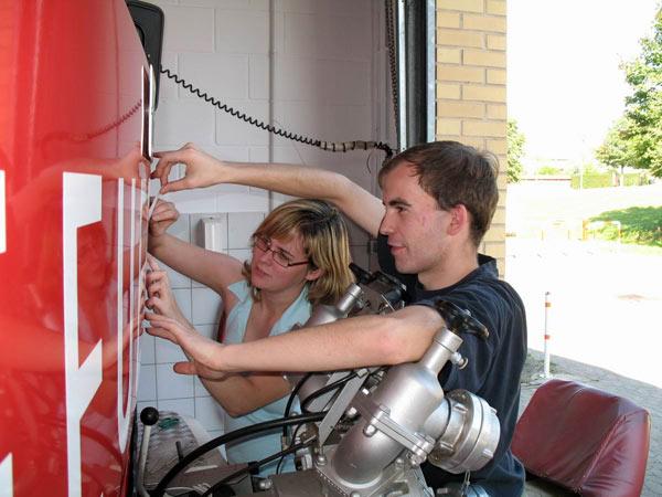 Aufgrund der Instandsetzungsarbeiten mussten einige Teile der Fahrzeugbeschriftung wie zum Beispiel der Funkrufname am Fahrzeugheck entfernt werden. Diese Beschriftungen wurden am Samstag, den 04. August 2007 durch sieben Kameraden des Löschbezirks Bubach-Calmesweiler erneuert. Die Beschriftung wurde mit weißer Klebefolie durchgeführt. Im Zuge dieser Arbeiten wurde auch die Fahrzeugkabine mit Lackreiniger behandelt und anschließend neu poliert. Ebenso wurde der Schriftzug "Feuerwehr" an der Fahrzeugvorderseite erneuert. DIeser wies aufgrund des Alters der dort verwendeten Folienbuchstaben von über zwanzig Jahren erhebliche Beschädigungen auf.