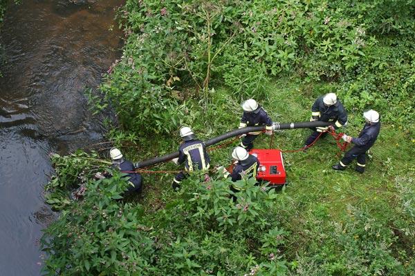 An der Ill direkt unter der Brücke der B10 am Ende der Dirminger Straße wurde eine Pumpe in Stellung gebracht, um das benötigte Löschwasser aus dem Bach zu entnehmen. Mehrere hundert Meter Schlauchleitung mussten dann über mehrere Höhenmeter bis zur Einsatzstelle verlegt werden. Eine große Hilfe dabei: Der Schlauchwagen, mit dem bis zu 1000 Meter des 75 Millimeter dicken B-Schlauchs in kürzester Zeit verlegt werden können. Um den Druckverlust durch den Höhenunterschied auszugleichen, musste eine Verstärkerpumpe zwischengeschaltet werden.