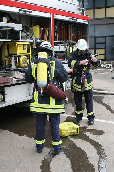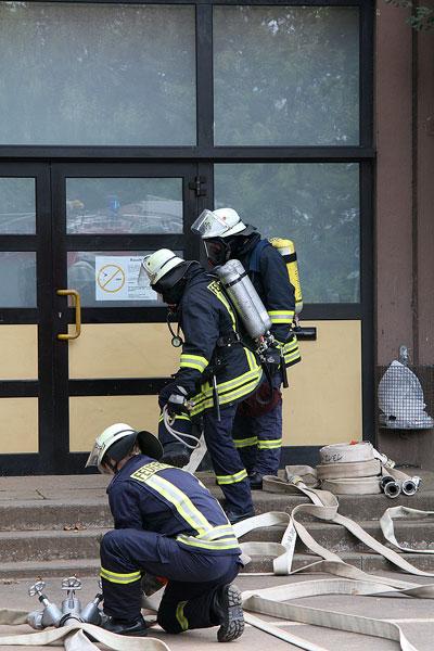Während vor dem Gebäude Hydranten angezapft und Schlauchleitungen verlegt wurden, drangen die Einsatzkräfte, ausgerüstet mit Atemschutzgeräten in das Gebäude vor, um die eingeschlossenen Personen zu suchen und ins Freie zu bringen. Ein Drucklüfter wurde vor der Eingangstür in Stellung gebracht, um den Brandrauch aus dem Gebäude zu drücken und so den vorgehenden Mannschaften bessere Sicht zu verschaffen. Die Vermissten wurden schnell gefunden und vor dem Gebäude von Sanitätern der Feuerwehr medizinisch versorgt.