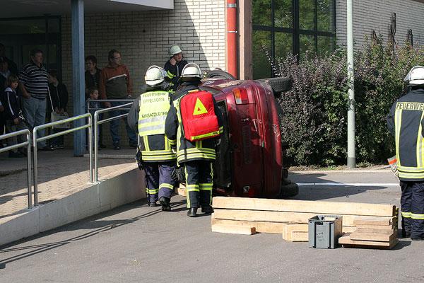 Hier müssen die Löschbezirke Hierscheid und Eppelborn ihr Können unter Beweis stellen. Mit Steckleiterteilen wird das Fahrzeug gegen ein Umstürzen gesichert. Routiniert bringen die Feuerwehrleute Feuerlöscher und Schläuche in Stellung, um sofort eingreifen zu können, sollte das Fahrzeug durch auslaufenden Kraftstoff in Brand geraten. Durch die Heckklappe dringt ein Sanitäter der Feuerwehr in das Fahrzeug vor und übernimmt die Versorgung und Betreuung der Fahrzeuginsassen.
