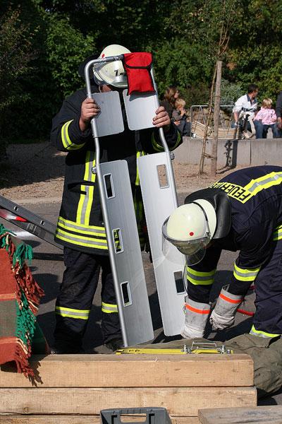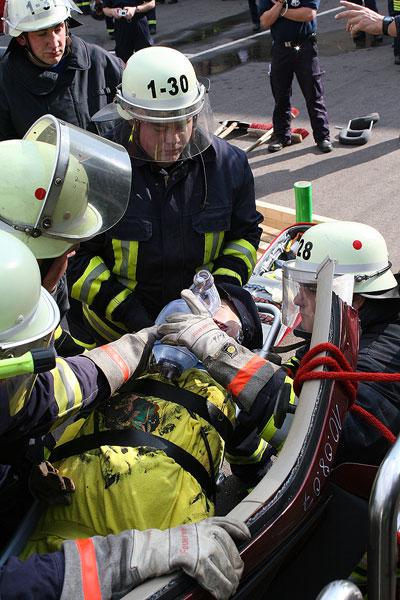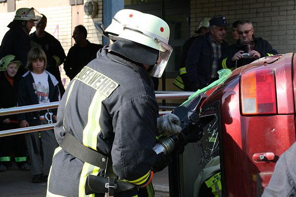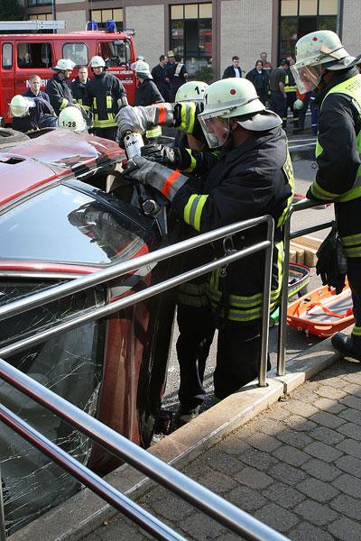 Die Zuschauer bekamen eine sogenannte "patientenorientiert Rettung" zu sehen, bei der die Patienten so schonend wie möglich aus dem Fahrzeug gerettet werden, um weitere Verletzungen zu vermeiden. Mit hydraulischen Rettungsgeräten wurde das Fahrzeugdach abtrennt und Platz für die Rettung geschaffen. Auch diese Übung meisterten die Einsatzkräfte mit Bravour, die eingeklemmten Fahrzeuginsassen konnten in der aufwändigen Befreiungsaktion gerettet und dem Rettungsdienst übergeben werden.
