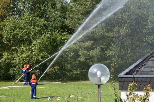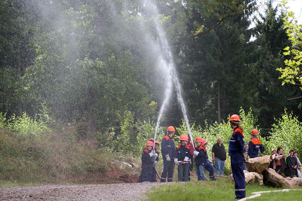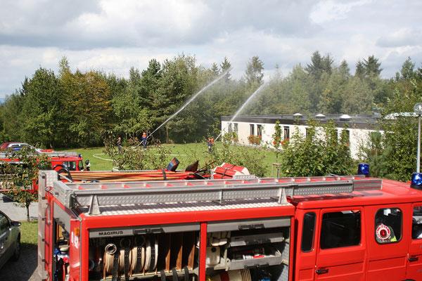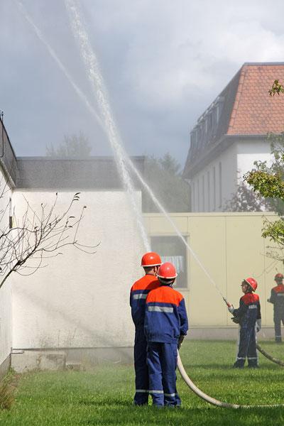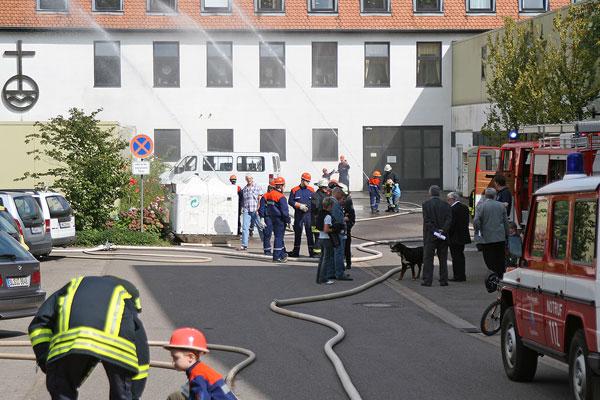Mit mehreren Fahrzeugen rückte der Feuerwehrnachwuchs aus allen Löschbezirken der Gemeinde zur Einsatzstelle aus. Pumpen wurden in Stellung gebracht, Schläuche ausgerollt und der angenommene Großbrand mit mehr als 20 Rohren bekämpft. Auch aus einem Löschteich auf dem Gelände des Pflegeheims wurde Löschwasser mit dicken Saugschläuchen entnommen. Mit großem Eifer waren die Jugendlichen bei der Arbeit.