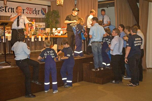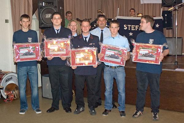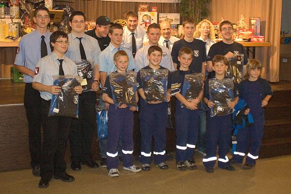 Die Jugendbetreuer Markus Leidinger und Melanie König-Schwan überreichten den von der Jugendfeuerwehr in die Einsatzabteilung übernommenen Jugendlichen eine Erinnerungsfoto als Präsent. Und hatten eine Überraschung für die Mädchen und Jungen der Jugendfeuerwehr: Sie konnten 20 Trainigsanzüge überreichen, die vom Stukkarteurbetrieb Stefan Holz gestiftet wurden.