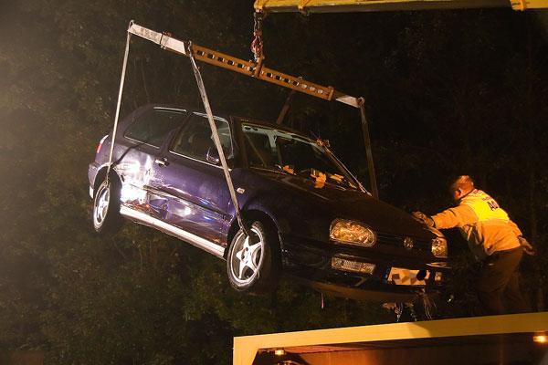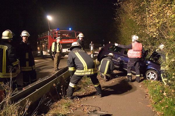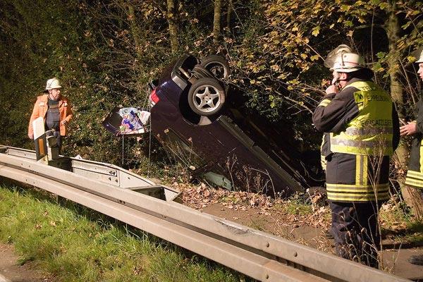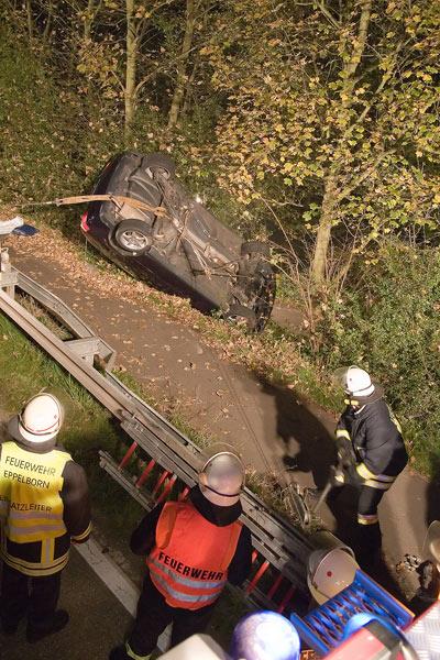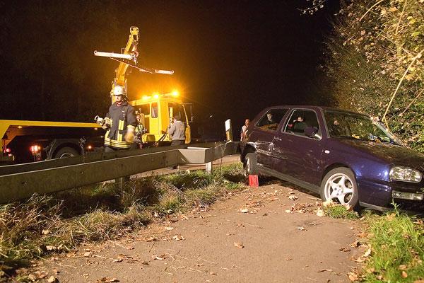 Die Feuerwehr sicherte das Unfallfahrzeug gegen ein weiteres Abrutschen durch Stahlseile und leuchtete die Unfallstelle mit Scheinwerfern aus. Mit der Seilwinde des Rüstwagens sowie einem Greifzug wurde der Golf auf den parallel zur B10 verlaufenden Radweg zurückgezogen und aufgerichtet.