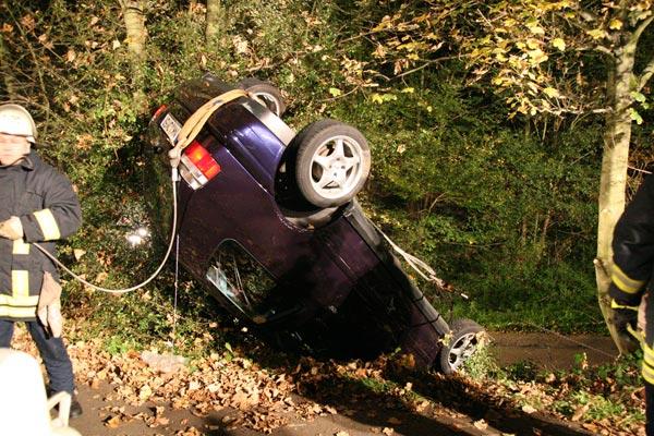 Eppelborn. Die Fahrerin eines Opel Corsa mit französischem Kennzeichen übersah am Abend des 12. Oktober 2007 offenbar bei der Ausfahrt vom Eppelborner Fischweiher auf die B10 ein aus Richtung Dirmingen kommendes Fahrzeug und nahm der Fahrerin des VW Golf die Vorfahrt. Nachdem sich die Fahrzeuge berührt hatten, kam die Fahrerin des Golf von der Fahrbahn ab und rutschte auf die dort beginnenden Leitplanken. Das Fahrzeug überschlug sich und blieb auf dem Dach in einer Böschung liegen.