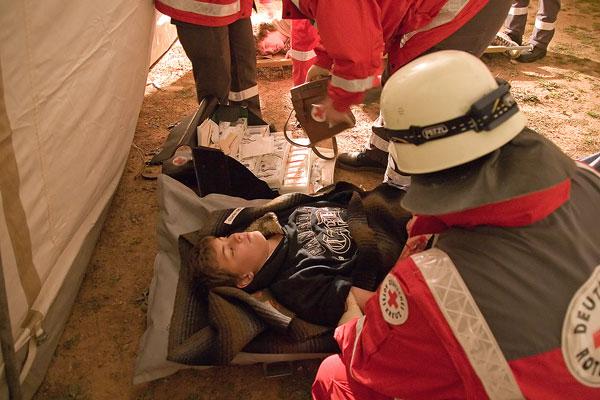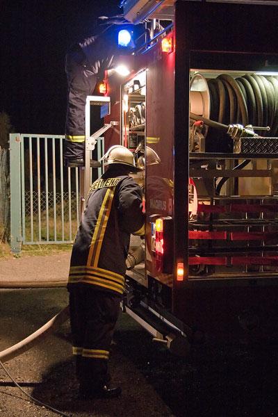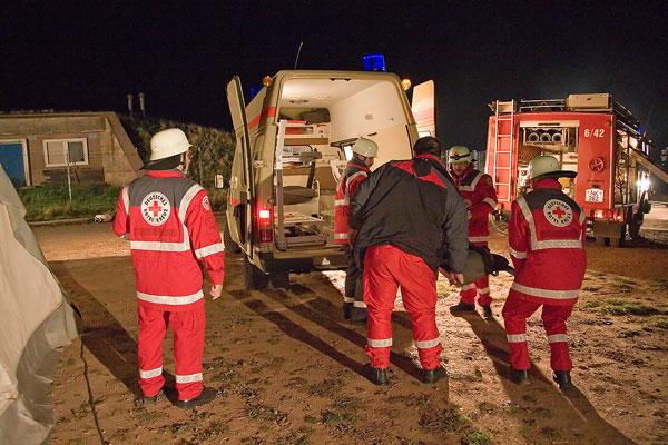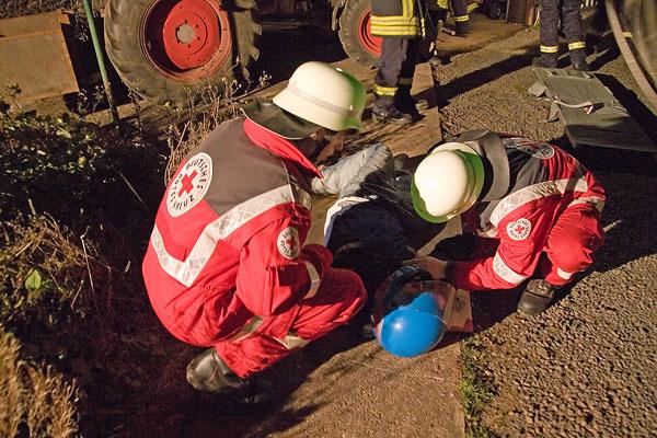 Nicht viele Feuerwehrleute kannten das Anwesen, zu dem sie zur Übung anrückten. Umso schwerer war es für sie, sich in der Dunkelheit zu orientieren. Mit Scheinwerfern wurde die Einsatzstelle ausgeleuchtet, Helfer des DRK errichteten einen Verbandplatz. Ausgerüstet mit Atemschutzgeräten erkundeten Feuerwehrleute das Anwesen und konnten die Verletzten in die Obhut des DRK übergeben. Wegen der Ausdehnung des Brandes wurde auch der Löschbezirk Wiesbach zur Unterstützung angefordert.