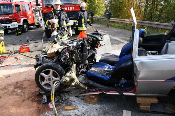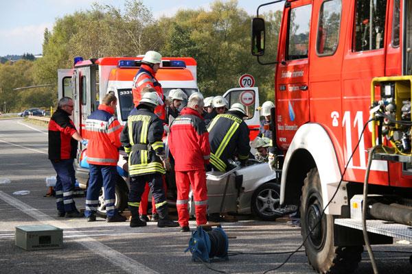Bubach-Calmesweiler. Die 23 jährige Fahrerin eines Ford Fiesta geriet am Nachmittag des 22. Oktober 2007 aus bisher noch ungeklärter Ursache auf der Bundesstraße B269 auf gerader Strecke in den Gegenverkehr und kollidierte frontal mit einem ihr entgegenkommenden Lastwagen. Durch die Wucht des Aufpralls wurde die junge Frau schwer verletzt in ihrem Fahrzeug eingeklemmt.