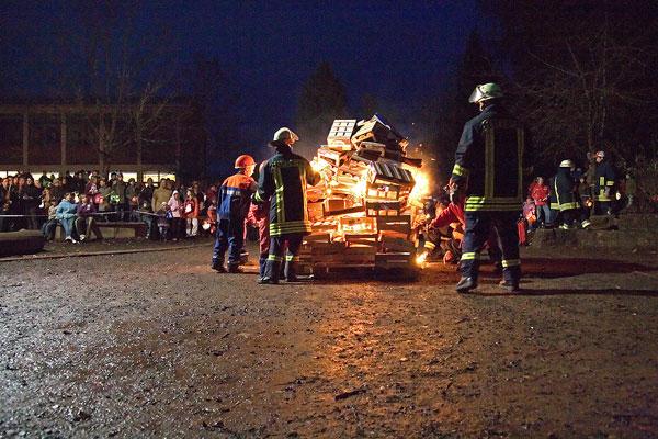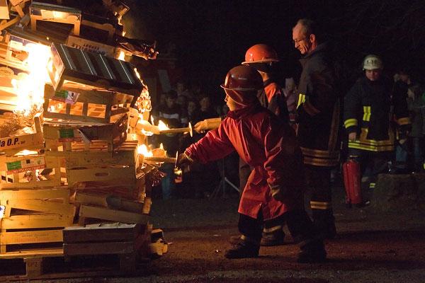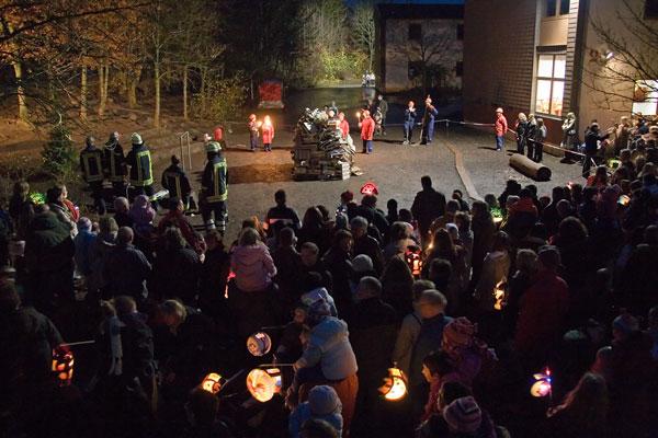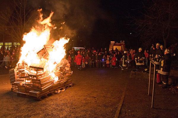 Auch die Jungen und Mädchen der Jugendfeuerwehr waren tatkräftig am Werk: Auf dem Schulhof hatten sie bereits gemeinsam mit ihren Jugendbetreuern das Martinsfeuer aufgebaut. Nach dem die Martinsgeschichte erzählt und gemeinsam Martinslieder gesungen waren, wurde das Feuer auf ein Zeichen von Pastor Marx entzündet.