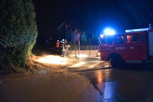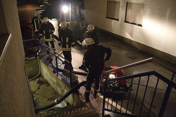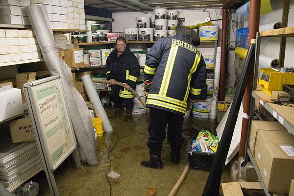Auch in Wiesbach wurde die Feuerwehr um kurz vor Mitternacht zum Einsatz gerufen: Hier drückte sich Grundwasser aus dem Boden im Raiffeisenmarkt in der Brühlstraße und überschwemmte die Lagerräume im Keller. Durch den schnellen Einsatz von Tauchpumpen konnte hier ein größerer Schaden verhindert werden.