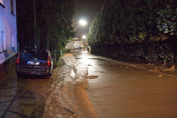 Gegen 21:45 Uhr dann der erste Notruf: In der Hellbergstraße im Ortsteil Eppelborn drang Wasser in einen Keller ein. Mit Sandsäcken konnten die telefonisch alarmierten Einsatzkräfte aus dem Löschbezirk Eppelborn ein weiteres Überfluten der Kellerräume verhindern. Noch vor Ort erreichte die Einsatzkräfte ein weiterer Hilferuf: In der Hellbergstraße hatten die Wassermassen aus einem Entwässerungsgraben Geröll und Äste mitgerissen und einen Kanaleinlauf verstopft. Das Wasser hatte bereits die gesamte Straße überflutet und drohte, in Keller einzudringen. Hier wurden die Wassereinläufe geöffnet und gereinigt, um wieder eine Ablaufmöglichkeit in die Kanalisation zu schaffen.