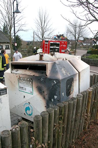 Wiesbach. Zu einem Containerbrand wurde der Löschbezirk Wiesbach am Nachmittag des 11. Januar 2008 gegen 16:05 in die Josefstraße gerufen. Dort brannten auf einem Containerstellplatz Altpapier und Kartonagen in einem Altpapierbehälter unter starker Rauchentwicklung.